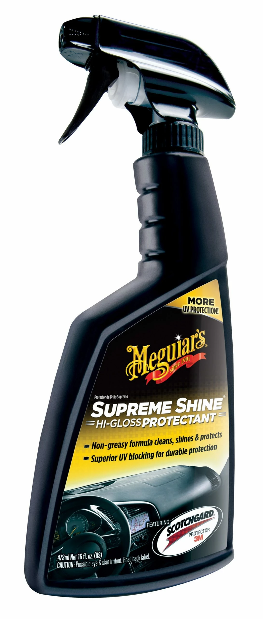 Meguiar’s Supreme Shine Hi-Gloss Protectant offer a superior high shine gloss with superior UV blocking protection to preserve vinyl, rubber and plastic surfaces. This non-greasy formula quickly cleans, shines and protects, defending against fading, cracking and aging in one easy step.