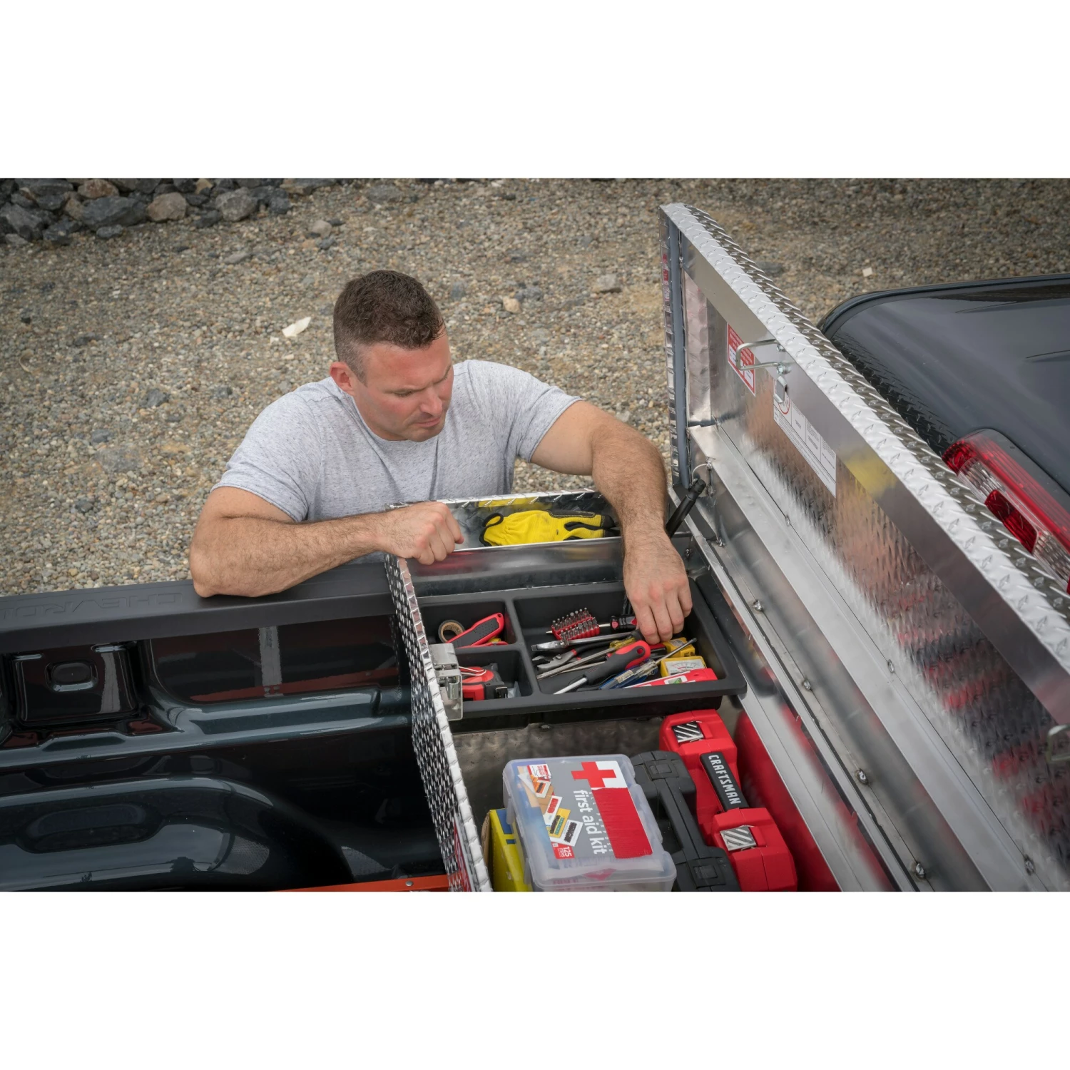 The CRAFTSMAN Aluminum Crossover Truck Tool Box is engineered with fully welded aluminum construction to ensure lasting durability. Its slim, space-saving design gives you more truck bed room to store other items. The one-touch access push button locks on both sides and automatically opens with the smooth-opening gas springs. The weather-block rubber seal keeps your stored items protected from the elements, so they are dry and ready to use. It is keyed with a locking paddle handle that latches to provide extra security and protection of your stored loose items. Includes a drill-free mounting kit and a removable sliding tool tray that keeps your tools organized, accessible, and ready for any job. Fits most full-sized pickups (see product images for compatibility).