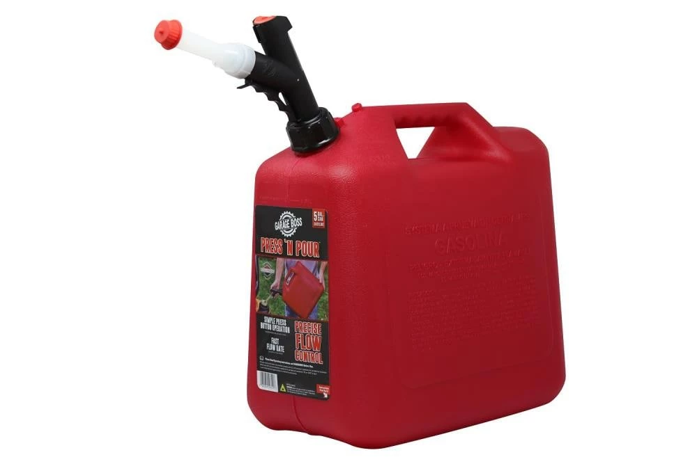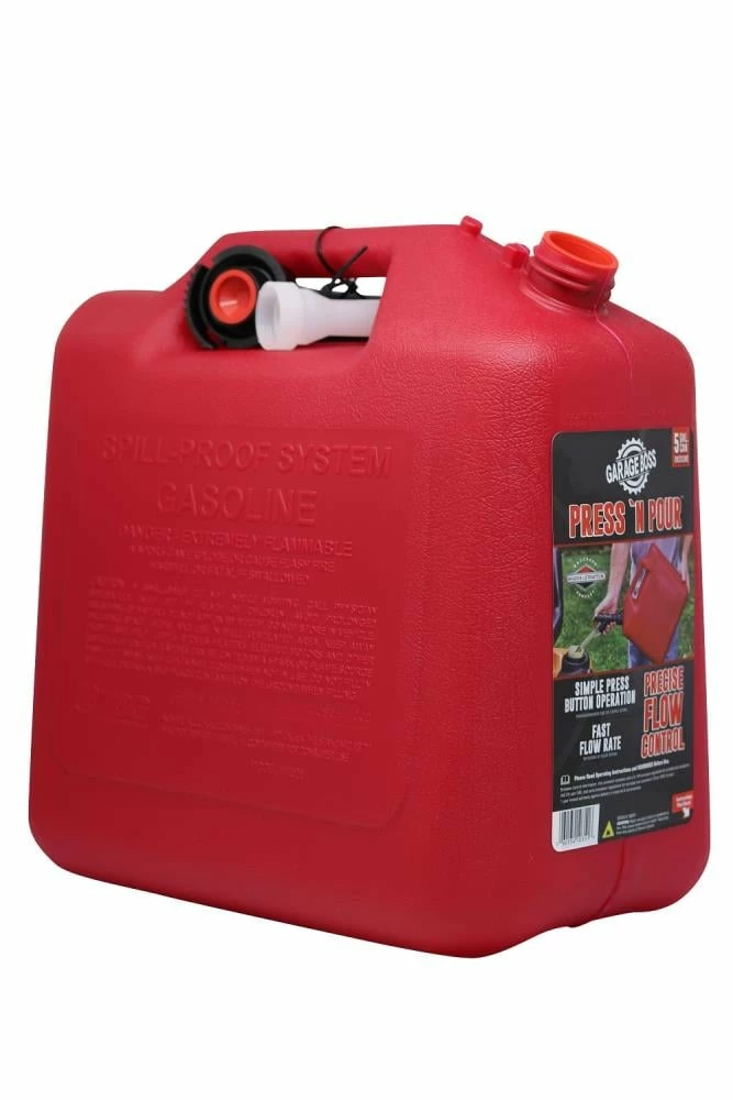 The garage boss press n pour 5 Gallon fuel filling system is the perfect solution to keep your medium to large die gas powered equipment running year round. Whether it be your ride-on mower, ATV, snowmobile or motorized watercraft, the ergonomically friendly design makes fueling your equipment est and clean. The EPA and Carb compliant spout and container includes a child safe cap and prevents fumes from escaping, as well as unnecessary spills. Along with the new easy to use press n pour spout, is the newly added flame mitigation device (FMD).