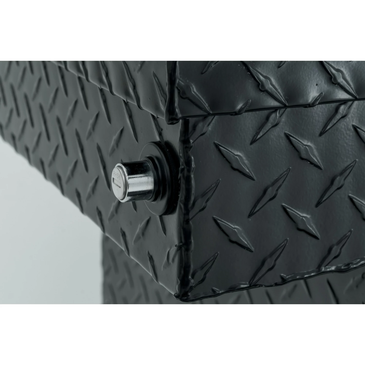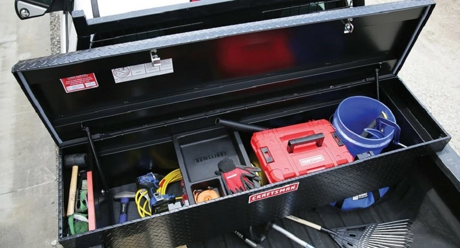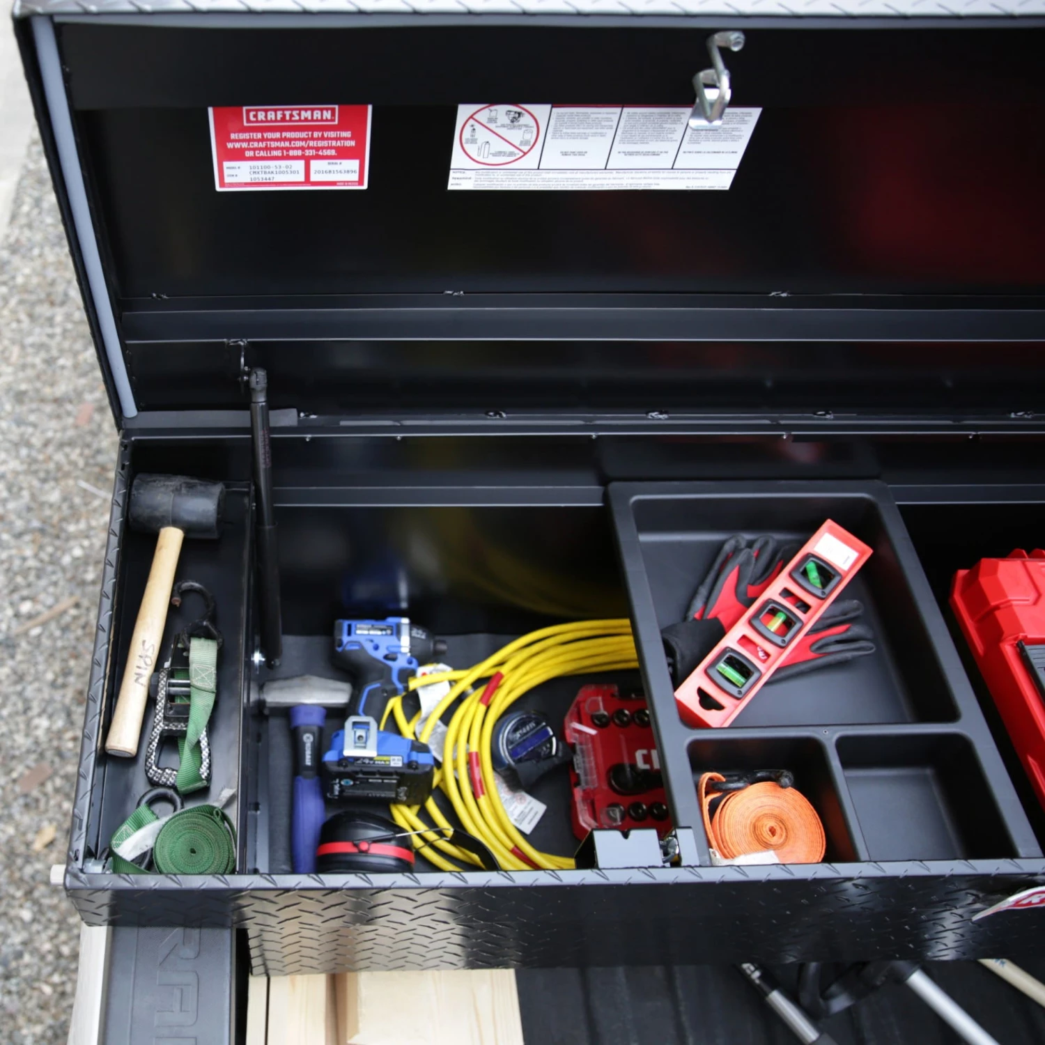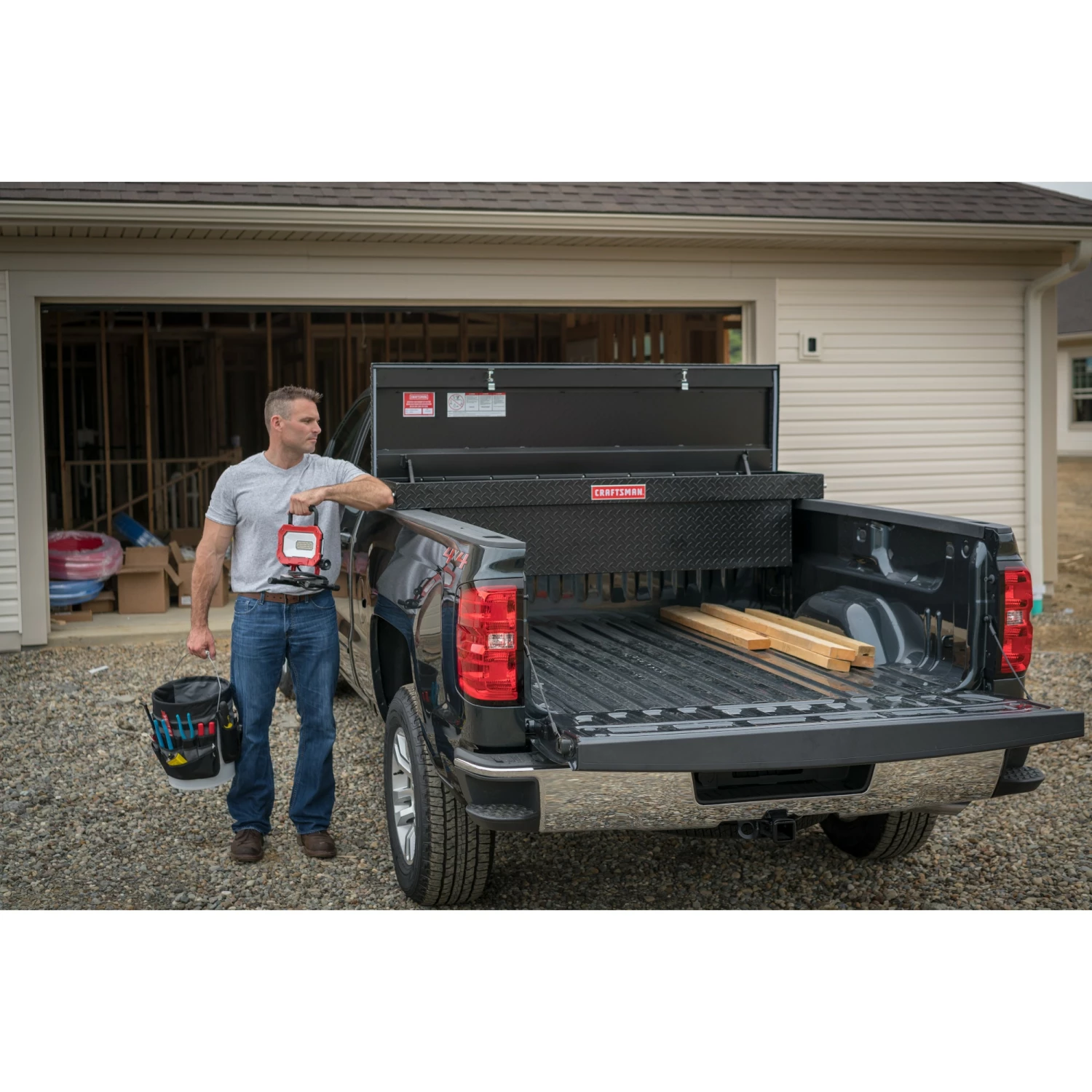 The CRAFTSMAN Aluminum Crossover Truck Tool Box is engineered with fully welded aluminum construction to ensure lasting durability and features a sleek matte black finish. Its slim, space-saving design gives you more truck bed room to store other items. The one-touch access push button locks on both sides and automatically opens with the smooth-opening gas springs. The weather-block rubber seal keeps your stored items protected from the elements, so they are dry and ready to use. It is keyed with a locking paddle handle that latches to provide extra security and protection of your stored loose items. Includes a drill-free mounting kit and a removable sliding tool tray that keeps your tools organized, accessible, and ready for any job. Fits most full-sized pickups (see product images for compatibility).