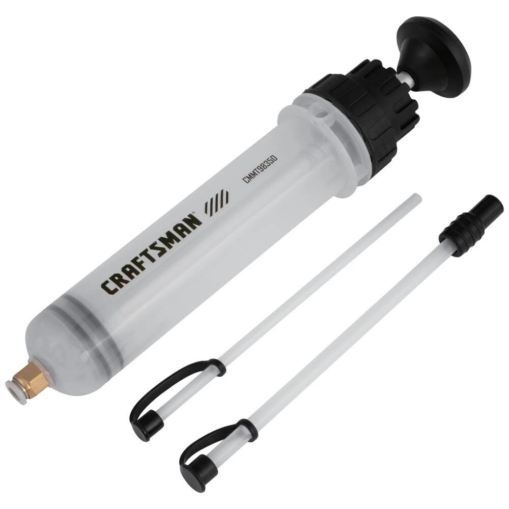 The CRAFTSMAN® Fluid Extractor is ideal when draining fluid from a reservoir is difficult or not possible. The hose extension can be placed into a reservoir to remove brake fluid, power steering fluid, gear oil, and more. A 7-oz fluid capacity is applicable to a wide range of applications. Polypropylene construction and double plunger seals to provide durability and help prevent leaking. The tool can also be used in reverse to fill reservoirs with fresh fluid.
